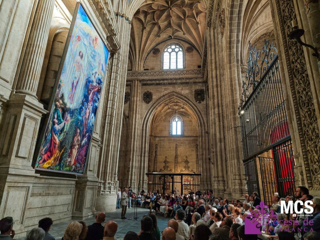 El acto de presentación en julio fue descrito como una “fiesta de agradecimiento” por el deán de la S.I.B Catedral de Salamanca, D. Antonio Matilla, quien elogió la dedicación del artista y la complejidad de una obra que incluye referencias al arte universal y elementos de la tradición popular, vinculados a las raíces serranas del pintor. La composición es, además, un homenaje a D. Daniel Sánchez, cuyo sueño de unir fe y modernidad encuentra ahora su culminación en la catedral salmantina.